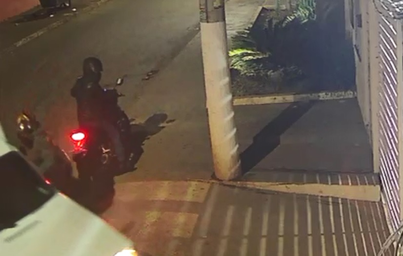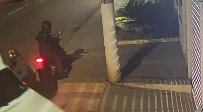 As imagens mostram o momento em que um morador chega ao condomínio e, no instante em que se prepara para entrar, dois homens em uma motocicleta param em frente ao portão e seguem em direção ao carro da vítima.