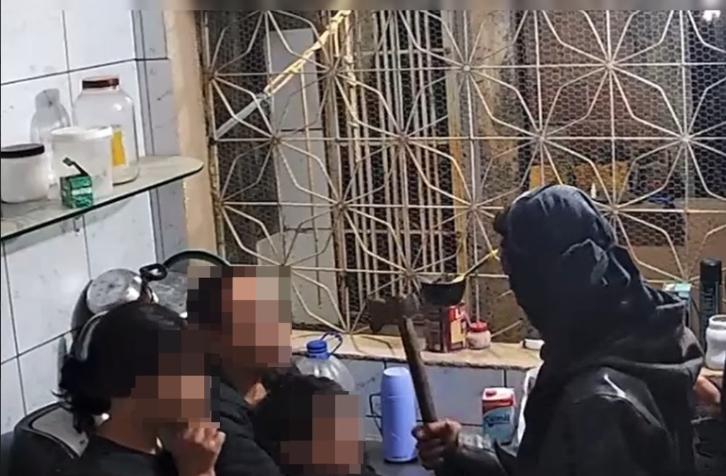 Conforme mostra o vídeo, os bandidos agem com violência contra as vítimas. Um deles grita, amedronta e, em determinado momento, puxa os óculos da mulher e arremessa no chão. Em seguida, ergue o machado e ameaça golpear a família, que, abraçada, pede calma aos assaltantes.