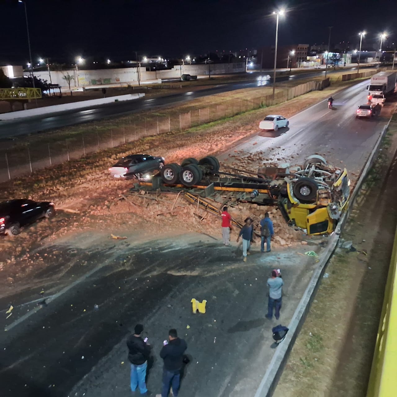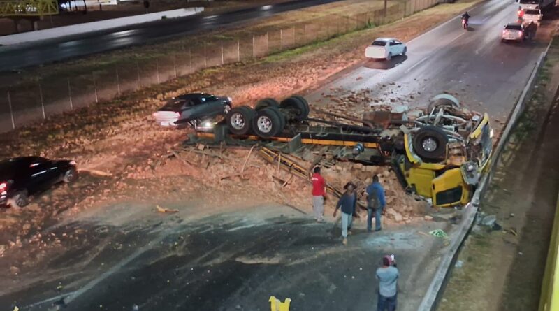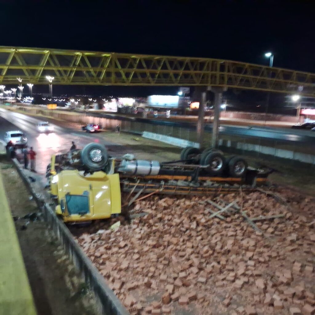 Um vídeo de câmera de segurança registrou o exato momento em que uma carreta tomba na BR-040, em Valparaíso de Goiás, durante a madrugada deste sábado (12). O acidente aconteceu no sentido Brasília e provocou a interdição total da rodovia por várias horas, até a remoção dos veículos e da carga espalhada na pista.