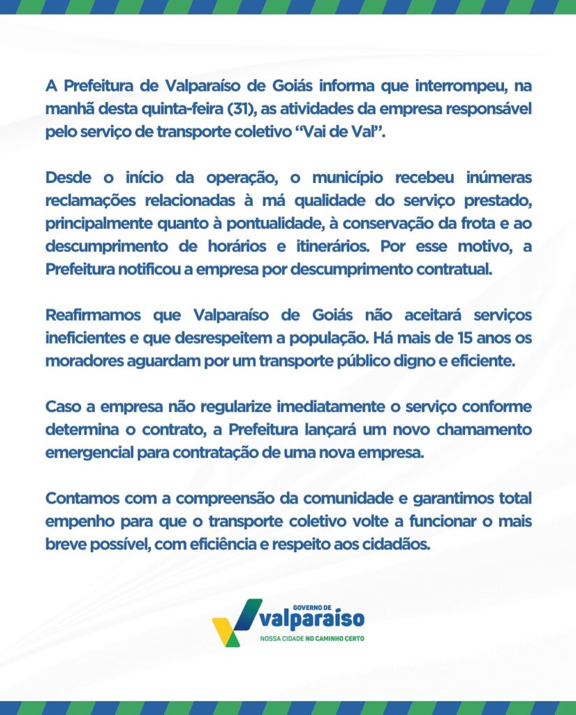 A Prefeitura de Valparaíso de Goiás anunciou, a suspensão das atividades da empresa responsável pelo transporte coletivo municipal “Vai de Val”. A decisão foi tomada após inúmeras reclamações de usuários sobre atrasos, descumprimento de horários e más condições da frota.