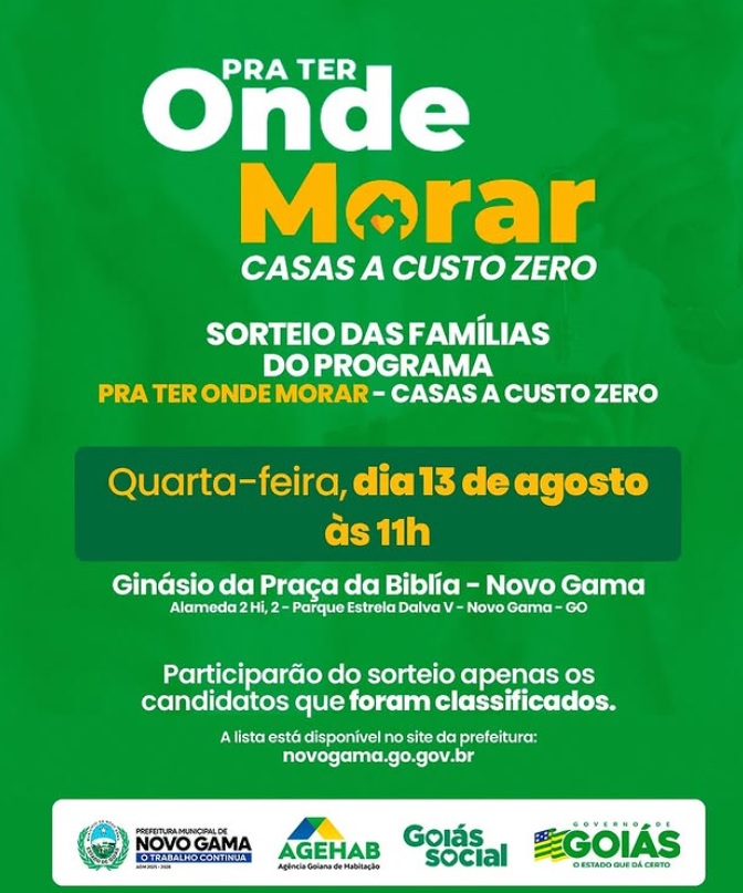 A iniciativa faz parte das políticas habitacionais do Governo de Goiás e da Prefeitura de Novo Gama, voltadas a garantir moradia digna para famílias em situação de vulnerabilidade. Apenas os candidatos previamente classificados poderão participar do sorteio, cuja lista está disponível no site da prefeitura (novogama.go.gov.br).