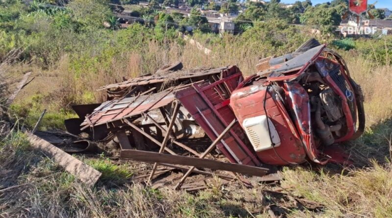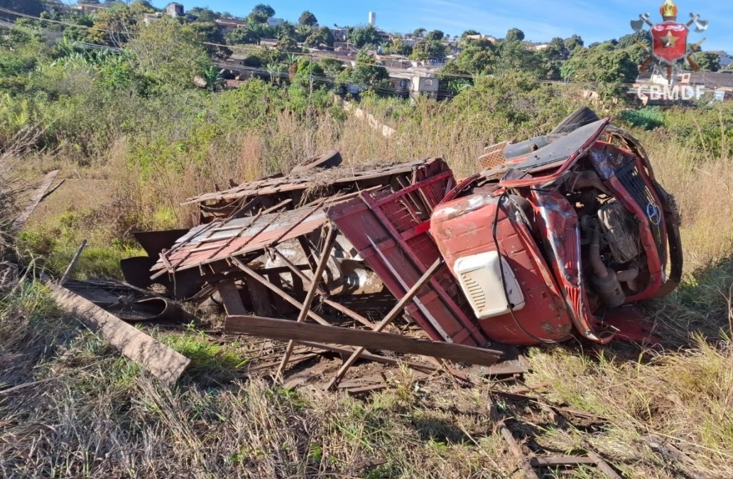 Um caminhão Mercedes Benz capotou após descer uma ribanceira na DF-290, em Santa Maria (DF), próximo ao Céu Azul (GO), nesta terça-feira (12/8). O acidente deixou o condutor levemente ferido.