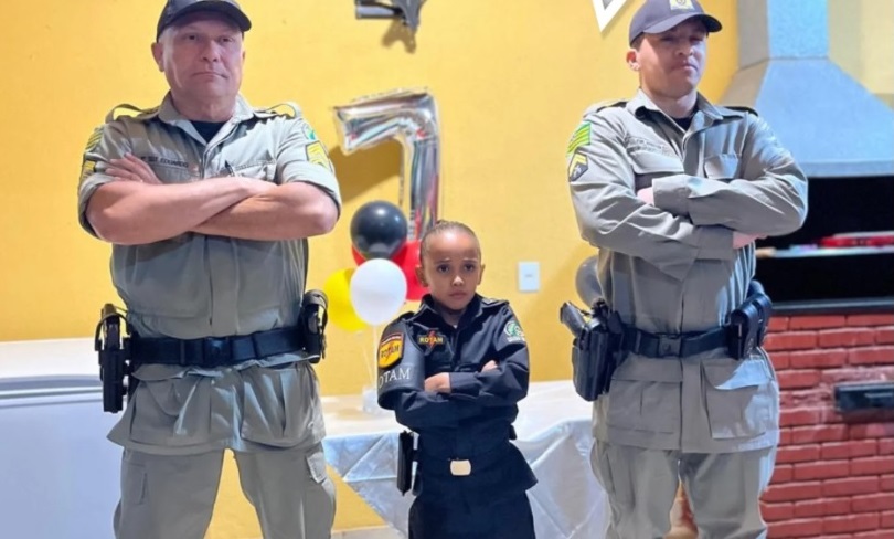 Menina de 7 anos comemora aniversário com farda da ROTAM e visita de policiais na Cidade Ocidental