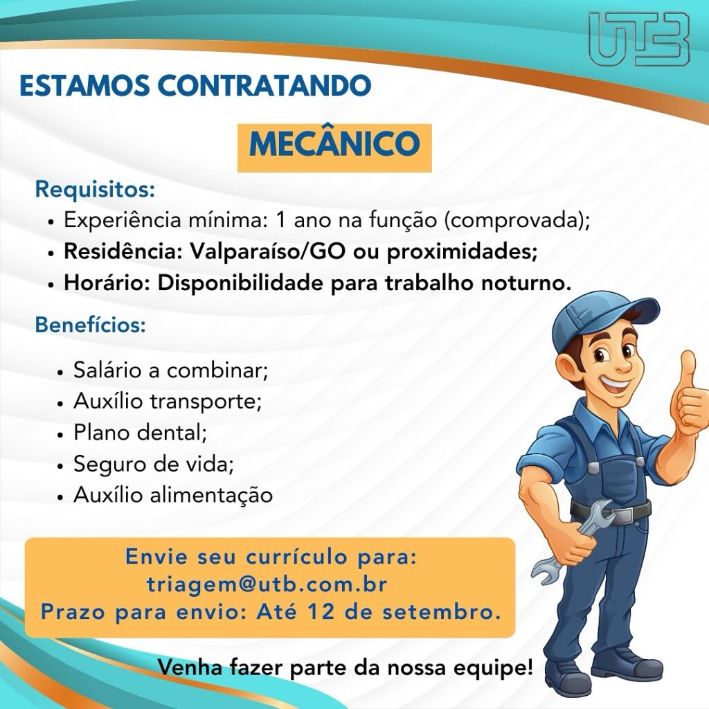 A União Transporte Brasília (UTB) está contratando mecânico com experiência comprovada de, no mínimo, um ano na função. Os candidatos devem residir em Valparaíso de Goiás ou regiões próximas e ter disponibilidade para trabalhar no período noturno.