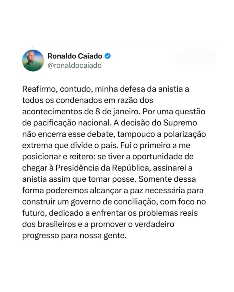 “Se tiver a oportunidade de chegar à Presidência da República, assinarei a anistia assim que tomar posse. Somente dessa forma poderemos alcançar a paz necessária para construir um governo de conciliação, com foco no futuro, dedicado a enfrentar os problemas reais dos brasileiros e a promover o verdadeiro progresso para nossa gente”, declarou.