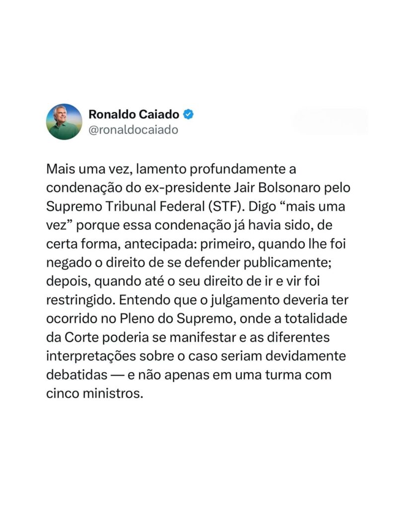Segundo Caiado, o julgamento deveria ter ocorrido no Pleno do Supremo, com a participação de todos os ministros, para garantir maior debate e transparência. “Lamento profundamente a condenação do ex-presidente Jair Bolsonaro. Essa condenação já havia sido, de certa forma, antecipada: primeiro, quando lhe foi negado o direito de se defender publicamente; depois, quando até o seu direito de ir e vir foi restringido”, afirmou o governador.