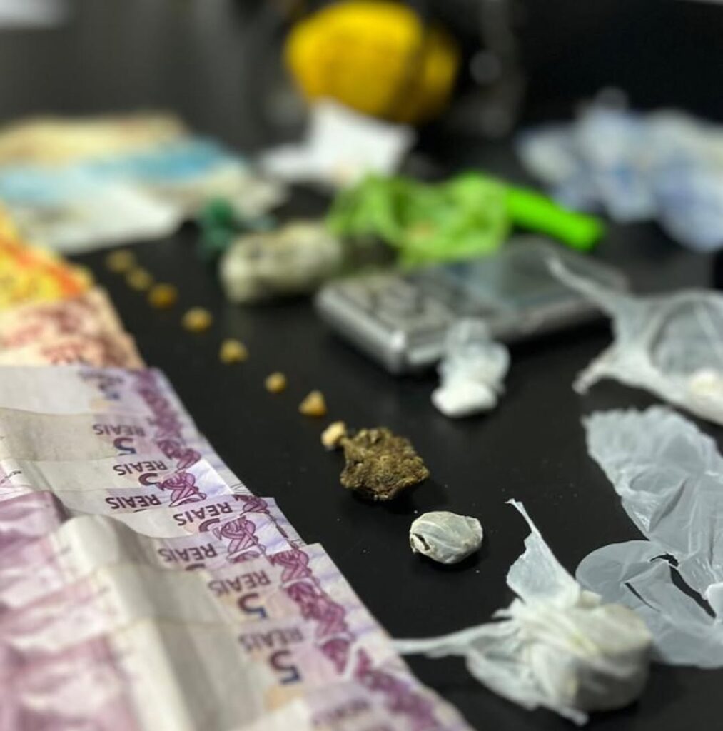 Durante as buscas, os policiais apreenderam porções de crack, maconha e cocaína, além de uma balança de precisão, um rádio comunicador, uma bicicleta, uma serra mármore sem comprovação de origem e dinheiro em espécie.