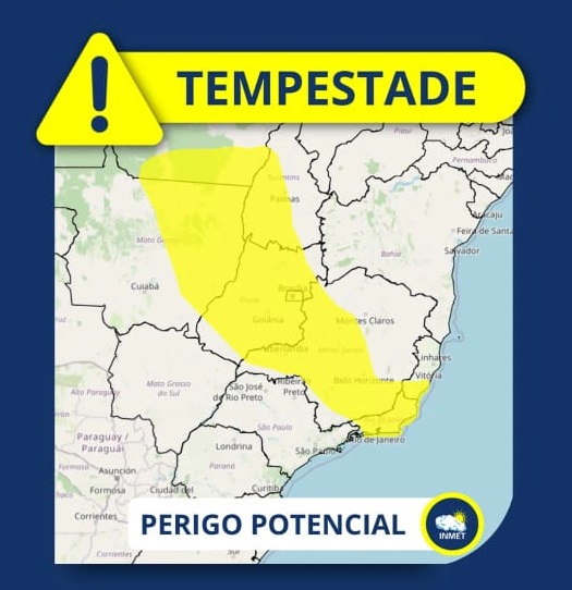 O Instituto Nacional de Meteorologia (INMET) emitiu alerta de perigo potencial de tempestades para Goiás e todo o Distrito Federal. O aviso é válido até amanhã (23) e prevê chuva intensa, com acumulados que podem chegar a 50 milímetros em 24 horas, ventos de até 60 km/h e possibilidade de queda de granizo.