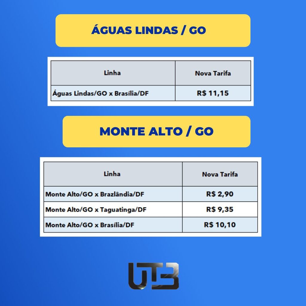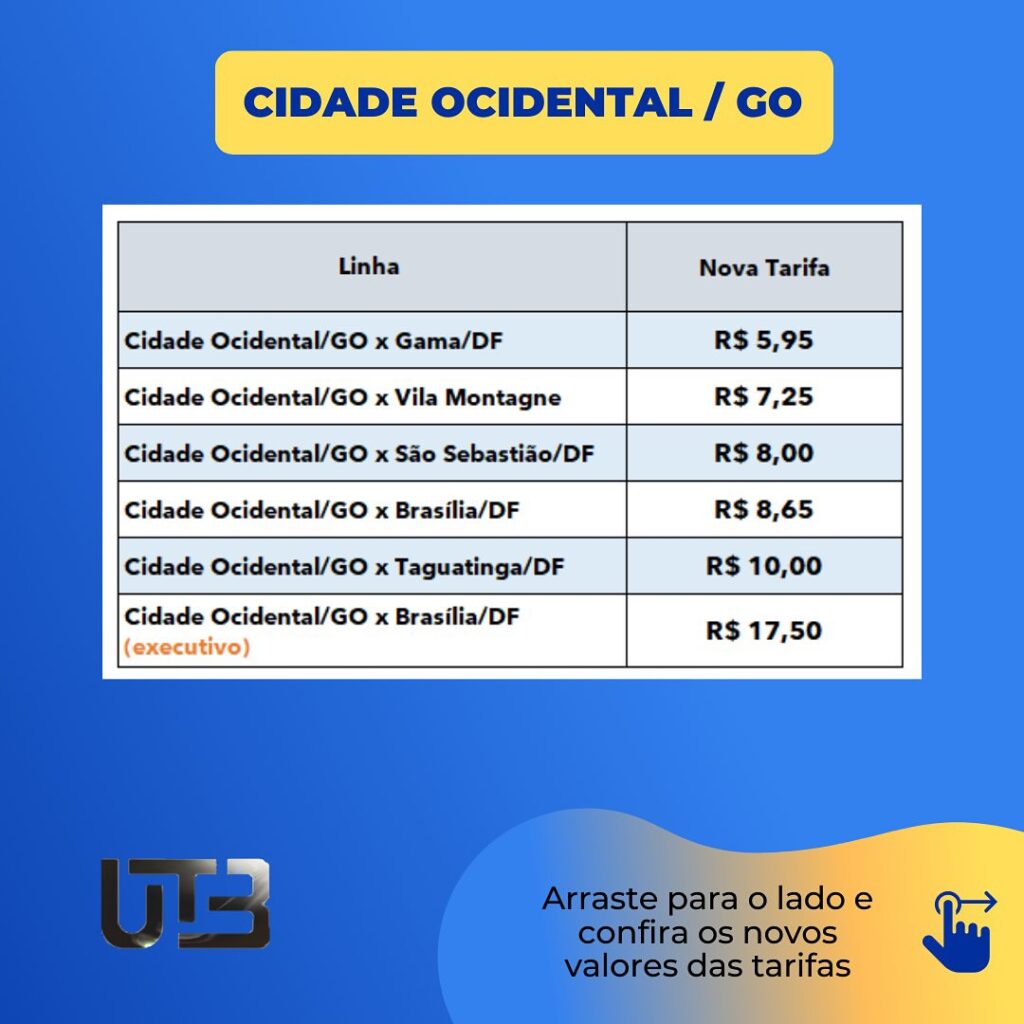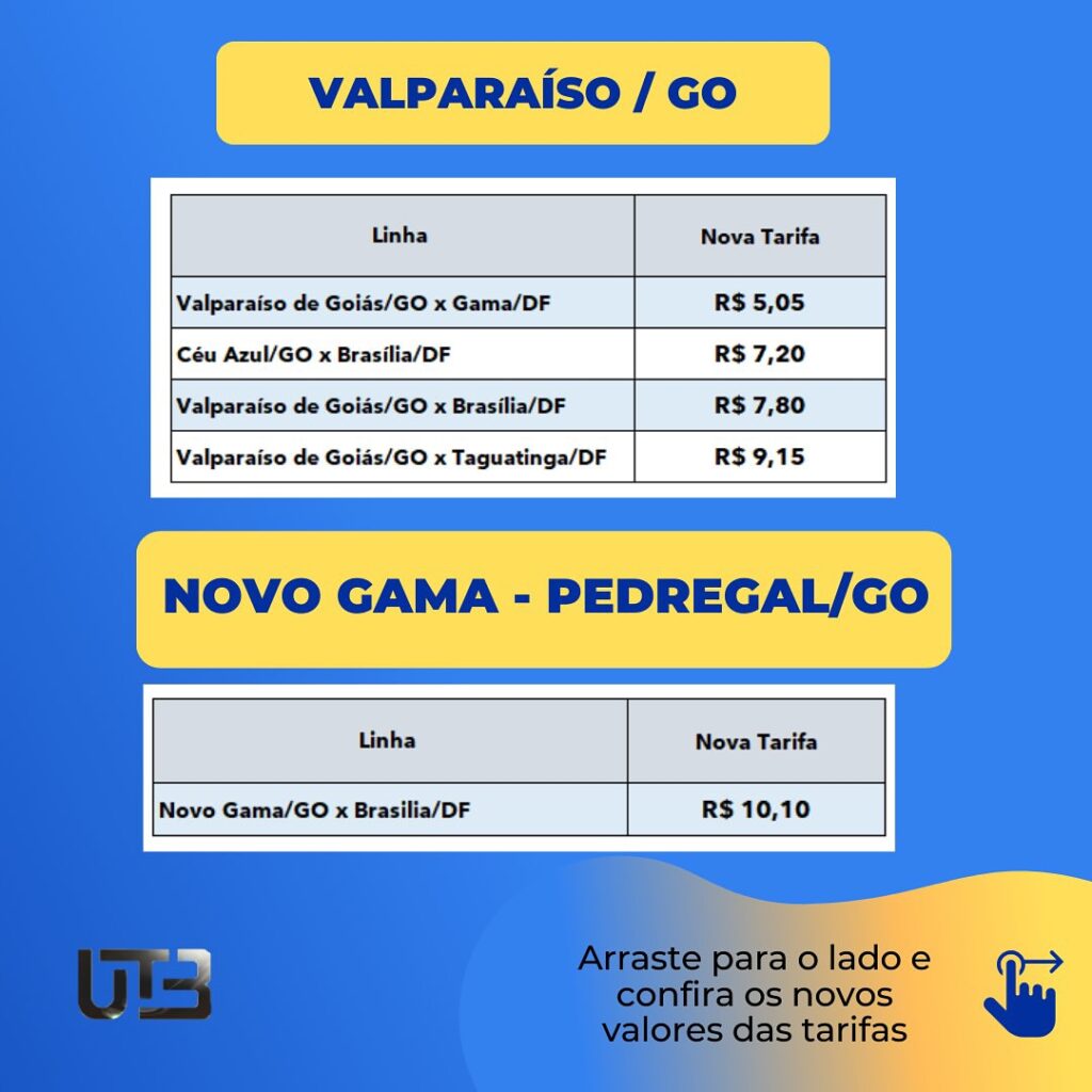 A União Transporte Brasília (UTB), responsável pelas linhas que ligam Cidade Ocidental, Valparaíso, Novo Gama e Águas Lindas de Goiás a Brasília, comunicou que o reajuste das tarifas, autorizado pela Agência Nacional de Transportes Terrestres (ANTT) para esta terça-feira (23), só será aplicado a partir da quinta-feira (25).