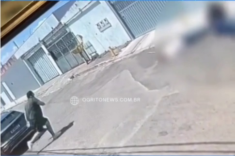 Neste momento, o homem, que se identificou como policial penal do Mato Grosso do Sul, sai de dentro do imóvel com um pedaço de madeira, na tentativa de assustar os criminosos. Um dos bandidos reage e at1ra nos dois. Em seguida, o homem cai no chão e a mulher sai mancando.