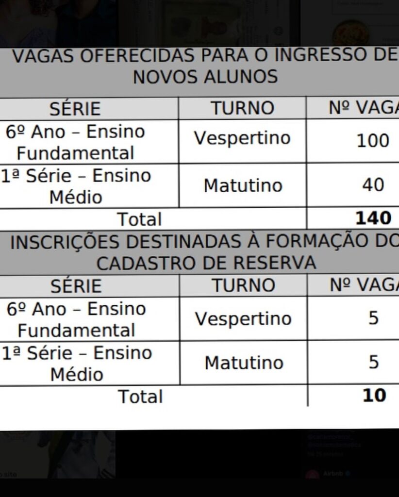 -Cidade Ocidental: 140 vagas – 6º ano (100, vespertino) e 1ª série do Ensino Médio (40, matutino).