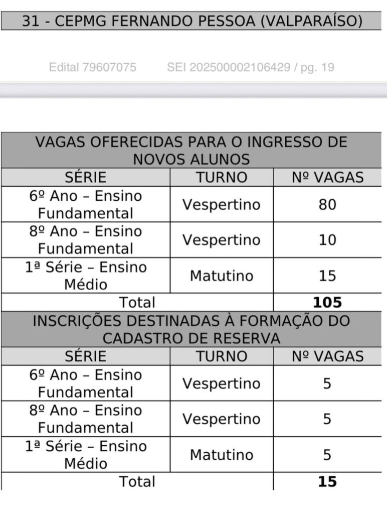 -Valparaíso (CEPMG Fernando Pessoa): 105 vagas – 6º ano (80, vespertino), 8º ano (10, vespertino) e 1ª série do Ensino Médio (15, matutino).