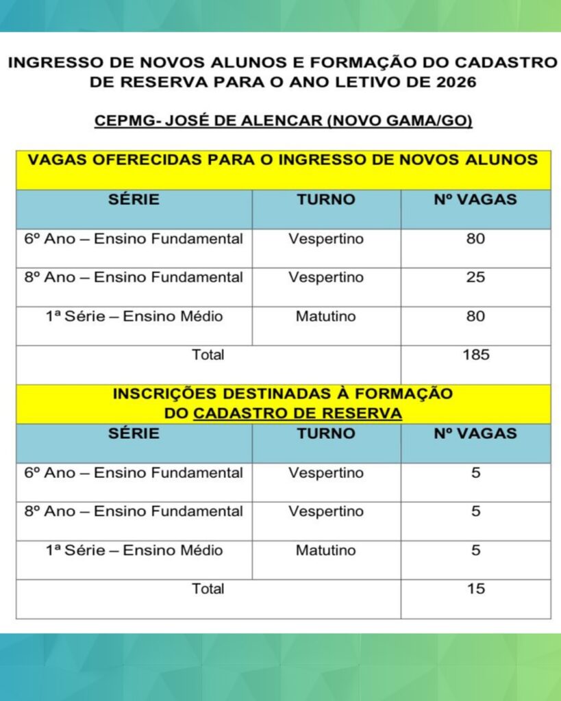 -Novo Gama (CEPMG José de Alencar): 185 vagas – 6º ano (80, vespertino), 8º ano (25, vespertino) e 1ª série do Ensino Médio (80, matutino).