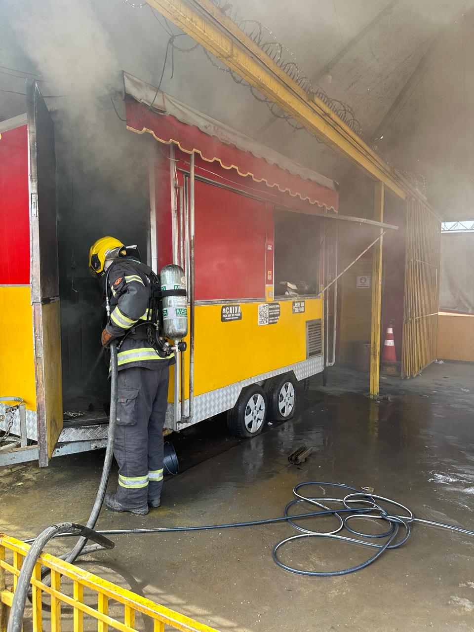De acordo com o Corpo de Bombeiros Militar, a equipe foi acionada assim que o incêndio começou. Quando os militares chegaram ao local, o fogo já atingia a parte lateral do trailer e ameaçava se espalhar para a tenda que cobria a estrutura.