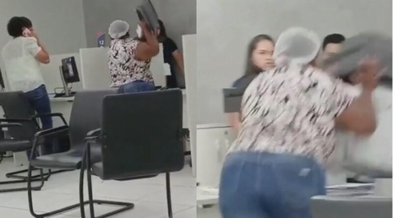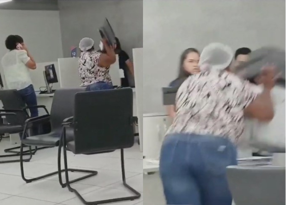Nas imagens, a mulher aparece alterada, arremessando monitores e impressoras contra o balcão de atendimento e em direção a funcionários. Segundo relatos, a confusão começou depois de várias tentativas frustradas de contato com a concessionária.