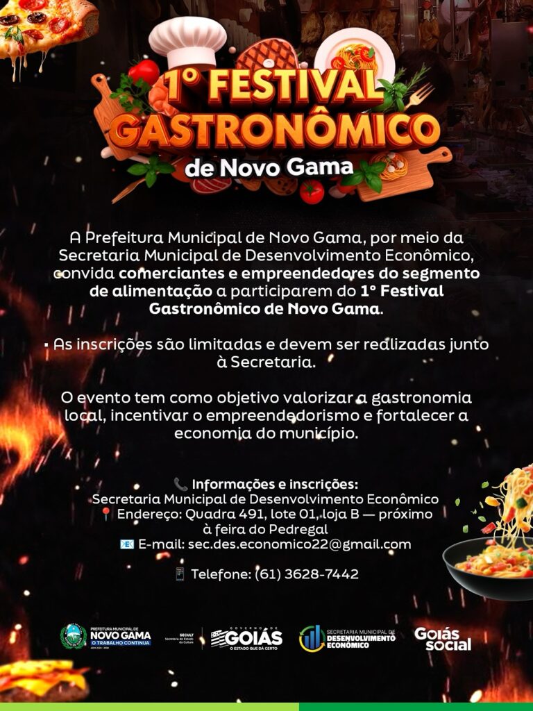 A Prefeitura de Novo Gama, por meio da Secretaria Municipal de Desenvolvimento Econômico, convida comerciantes e empreendedores do setor de alimentação a participarem do 1º Festival Gastronômico de Novo Gama, que acontecerá nos dias 14 e 15 de novembro.