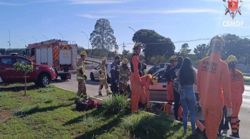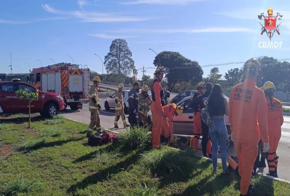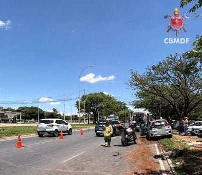 De acordo com o Corpo de Bombeiros Militar do Distrito Federal (CBMDF), quatro viaturas foram mobilizadas para atender a ocorrência. No local, os socorristas encontraram um Hyundai Creta, um Honda Fit, um Toyota Corolla, um Fiat Uno — que capotou e atingiu um poste de iluminação — e uma motocicleta Honda NX Falcon.
