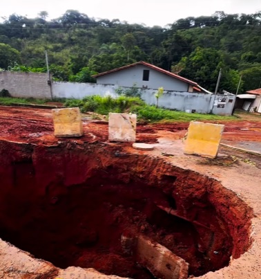 Um vazamento de esgoto provocou uma erosão significativa na Quadra 01 no bairro Ocidental Park, em Cidade Ocidental, após a passagem de um caminhão na região. O incidente ocorreu na pista que desce da Secretaria de Infraestrutura, onde o solo já apresentava infiltrações antigas.
