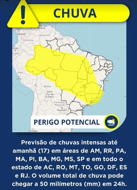 O Instituto Nacional de Meteorologia (Inmet) emitiu um alerta na manhã desta terça-feira (16), de potencial para chuvas intensas, que inclui todo o estado de Goiás e Distrito Federal. O aviso permanece válido até esta quarta-feira (17) e indica a possibilidade de volumes elevados de chuva em curto período de tempo.