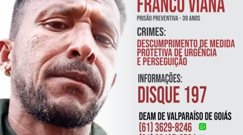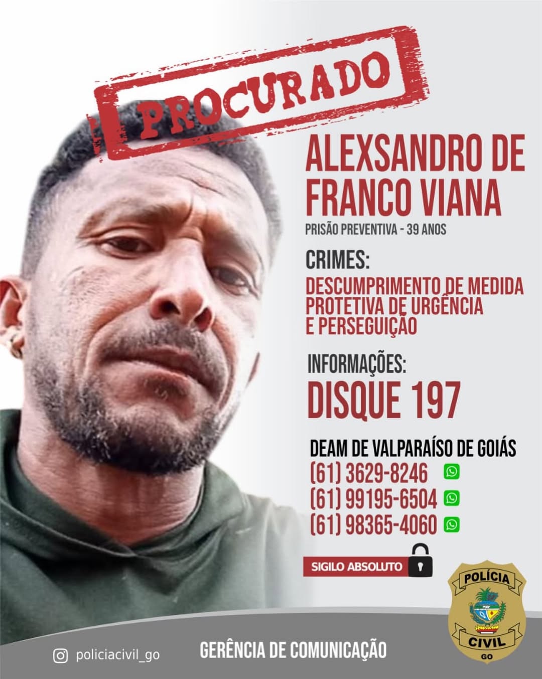 A Polícia do Estado de Goiás prendeu, nesta terça-feira (16), Alexsandro de Franco Viana, de 39 anos, investigado pelos crimes de perseguição (stalking) e descumprimento de Medida Protetiva de Urgência, em Valparaíso de Goiás.