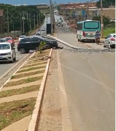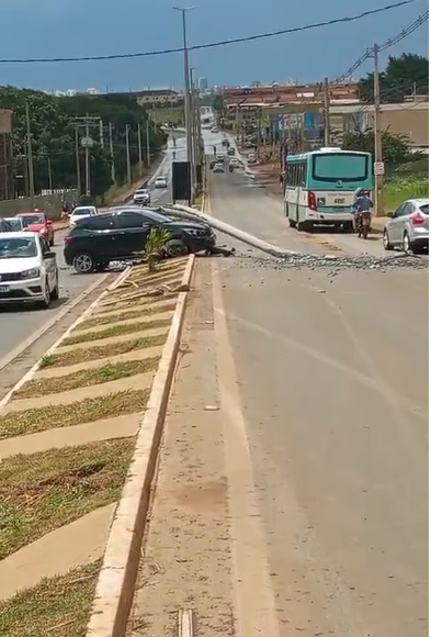 Acidente envolvendo três veículos deixa poste no chão em Cidade Ocidental