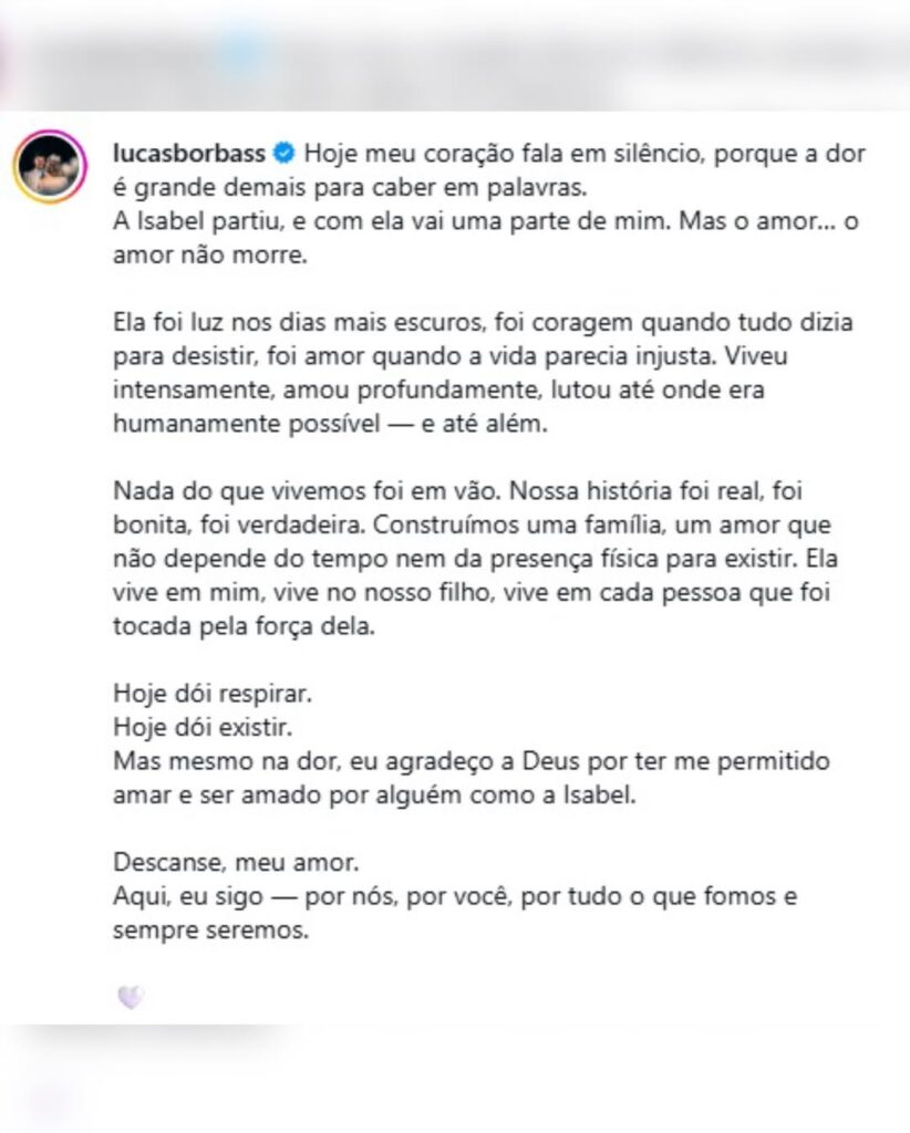 No texto publicado no Instagram, Lucas disse que sua dor “é grande demais para caber em palavras”. “A Isabel partiu, e com ela vai uma parte de mim. Mas o amor… O amor não morre”, escreveu.
