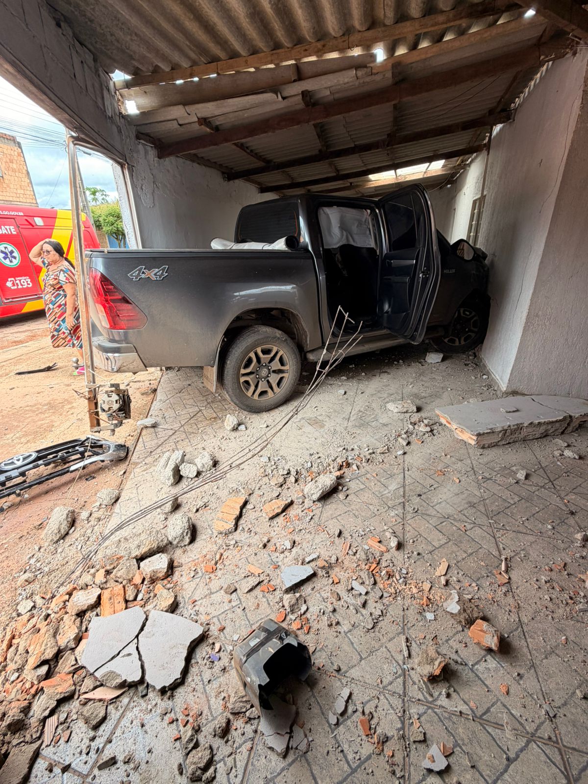 No local, foi constatado que uma caminhonete Hilux colidiu com um veículo Strada em um cruzamento. Com o impacto, um dos veículos acabou atingindo uma pedestre que caminhava pela calçada, fazendo com que ela fosse arremessada para o interior de uma residência.