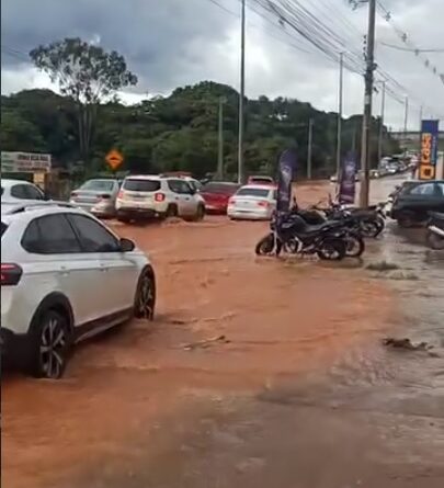 Forte chuva causa alagamento em via de Cidade Ocidental