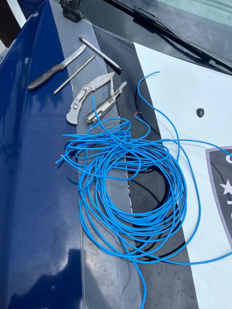 Durante a revista pessoal, os guardas encontraram três facas em posse do suspeito, além de cabos elétricos que podem ter sido subtraídos do sistema de iluminação pública. O material foi apreendido e encaminhado junto com o detido.