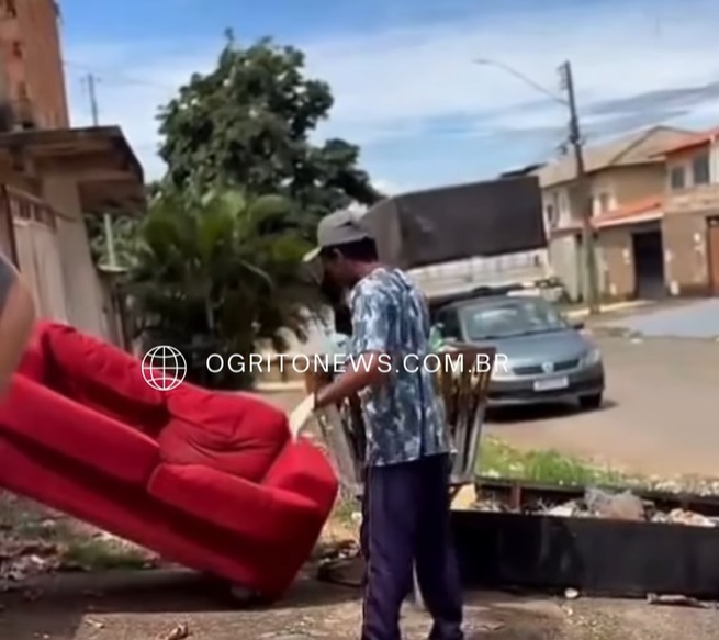 Nas imagens, o prefeito mostra móveis e objetos jogados de forma inadequada em via pública, como sofá, cama, caixa de som e outros resíduos, em frente a um condomínio. Ele critica a prática e reforça que a atitude prejudica a cidade e desrespeita os moradores.