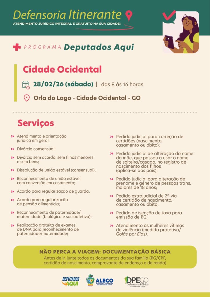 A Defensoria Pública do Estado de Goiás (DPE-GO) realizará atendimentos jurídicos gratuitos à população em situação de vulnerabilidade no município de Cidade Ocidental, no próximo dia sábado (28/02), das 08 às 16 horas, durante o evento Deputados Aqui. A ação será realizada na Orla do Lago.
