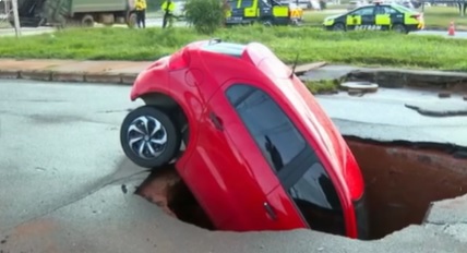 Carro é “engolido” por cratera no DF após fortes chuvas