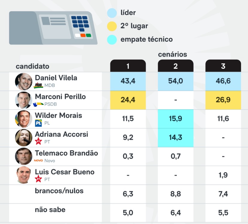 No primeiro cenário, que não inclui o nome de Luís Cesar Bueno (PT), Daniel Vilela aparece com 43,4% das intenções de voto. Em seguida, está o ex-governador Marconi Perillo (PSDB), com 24,4%.